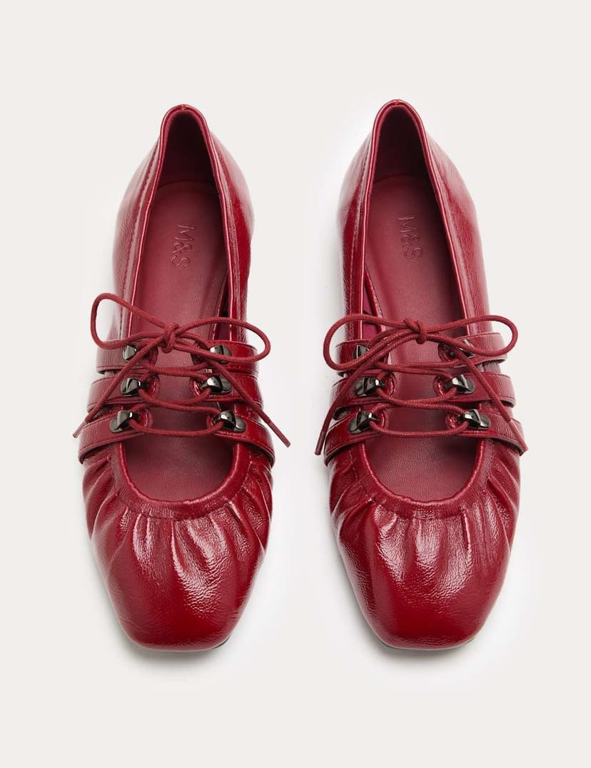 These dark red leather ballet pumps from M&S feature a flat heel and hook lace fastening with subtle ruching for an elegant touch. Perfect for everyday wear.