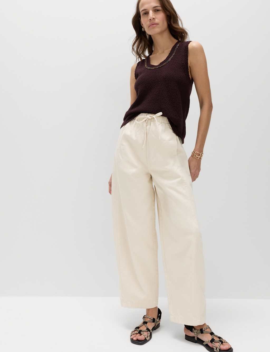 Designed in ecru, these high-waisted barrel leg jeans feature an adjustable drawcord tie at the waist for a fluttery detail. The pure cotton fabric ensures comfort and durability, while the ankle-grazer length hems add a laidback touch.