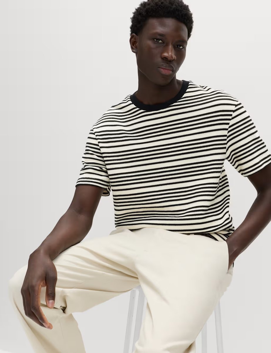 The M&S Relaxed Fit Cotton Rich Striped T-Shirt in Ecru is ideal for casual, smart-casual.