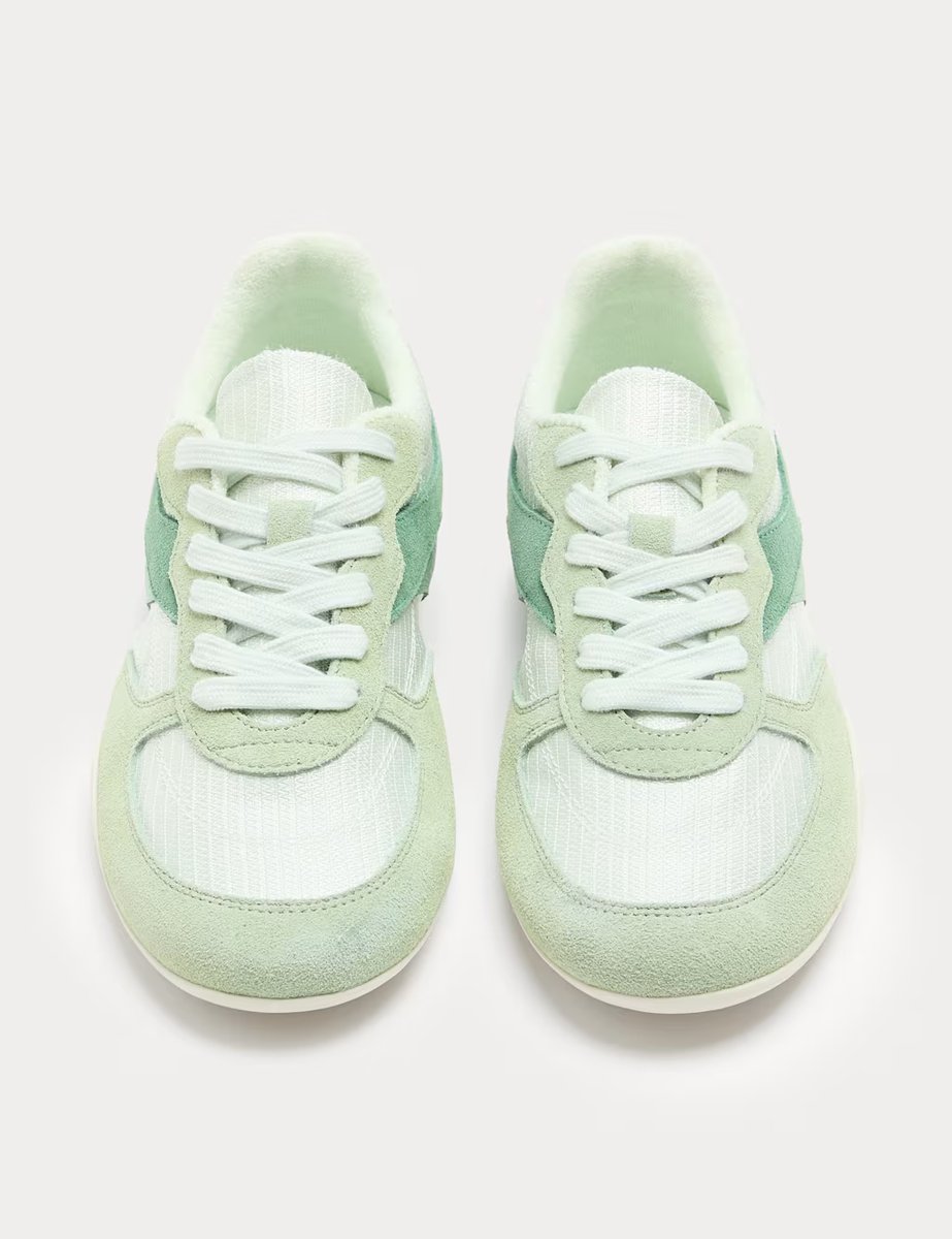 The M&S Retro Runner Trainers with Leather Mix in Green is available in sizes 3, 4, 5, 6, 7, 8.