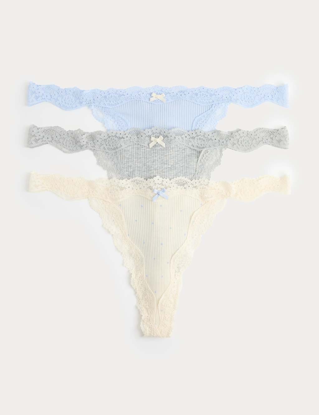 The M&S 3 Pack Cotton Blend Rib Lace Thongs Grey Mix is available in sizes extra small, L, M, S.