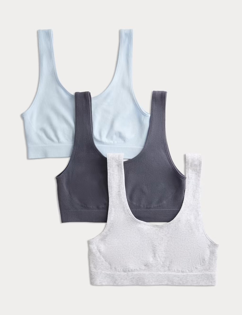 These seamless crop tops offer soft support for effortless lounging. The pull-on style features a non-wired, unpadded design for natural comfort, while the smooth fabric ensures a soft feel against the skin. This practical three-pack comes in a simple design that provides low-impact support for everyday wear.