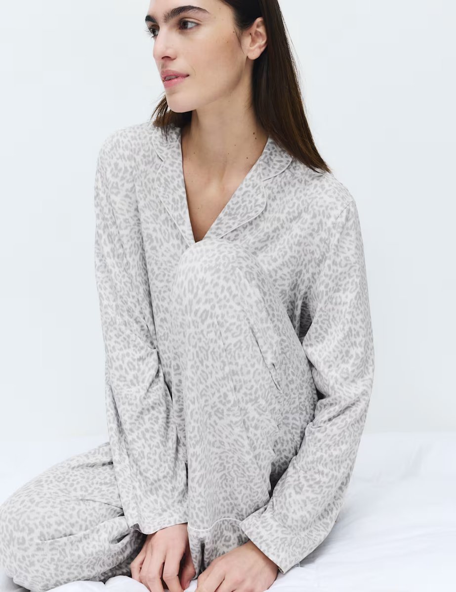 The M&S Soft Touch Printed Pyjama Set in Grey Mix is ideal for lounge.