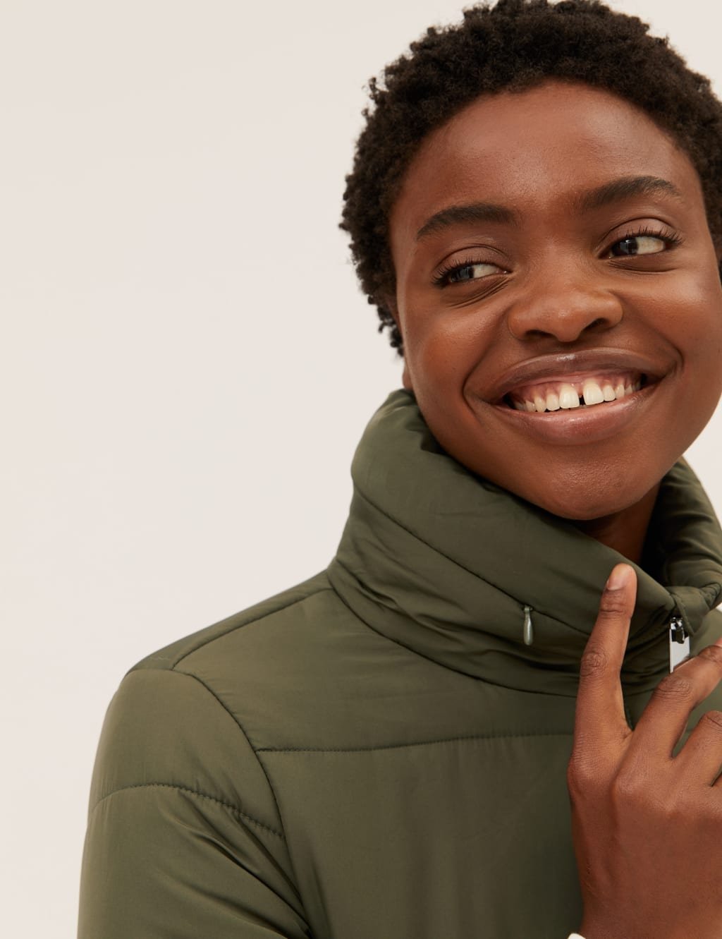 Stay warm with this zip-up M&S funnel neck coat in Hunter Green. It features a regular fit, horizontal quilting for warmth, and elasticated cuffs to keep the cold out. The water-repellent Stormwear™ technology and recycled materials make it both stylish and eco-friendly.