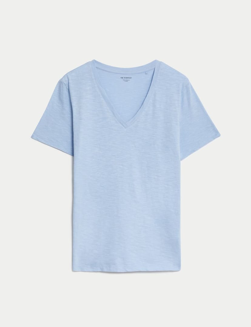 The M&S Ice Blue Pure Cotton V-Neck T-Shirt is made from cotton.