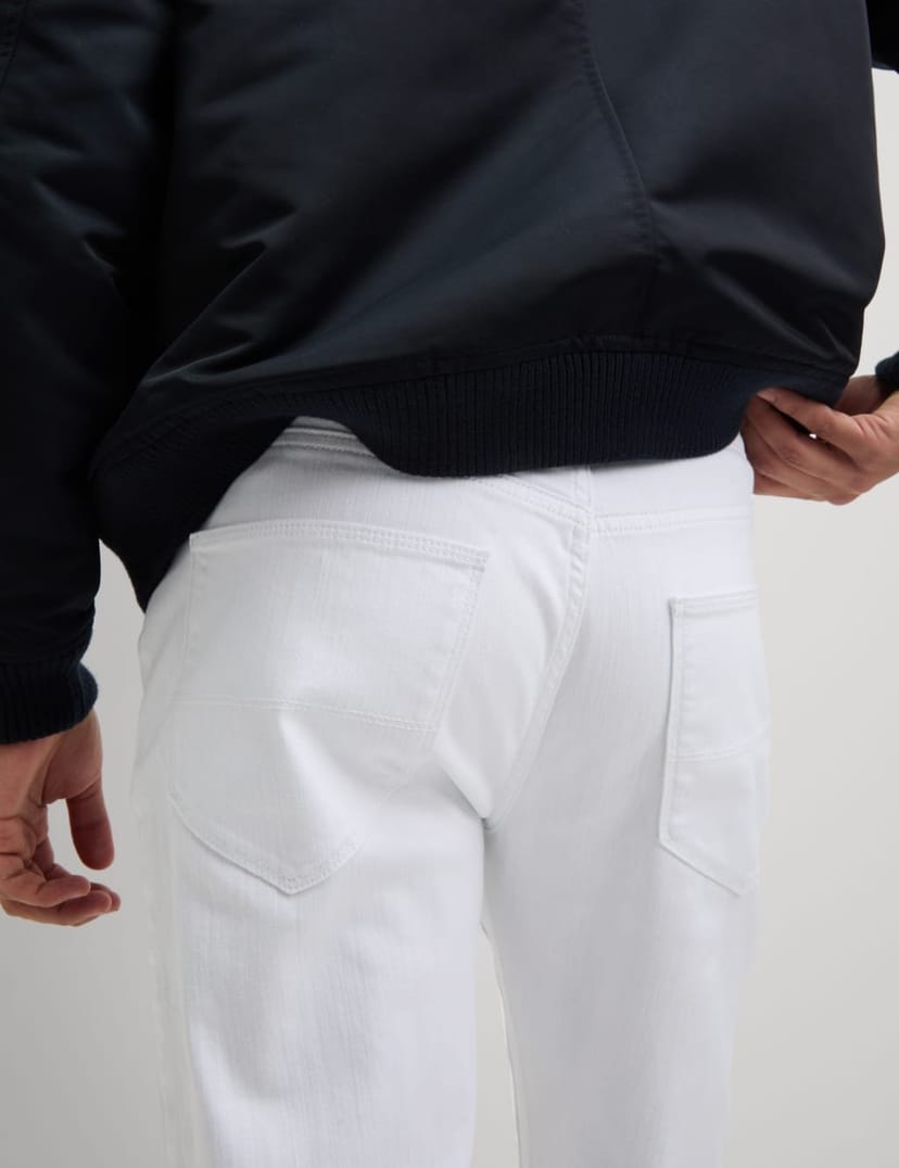 Sleek ice white slim-fit stretch jeans with a contemporary fit. Made from stretchy cotton fabric for comfort and ease of movement. Features a classic button and zip fastening for a secure fit.