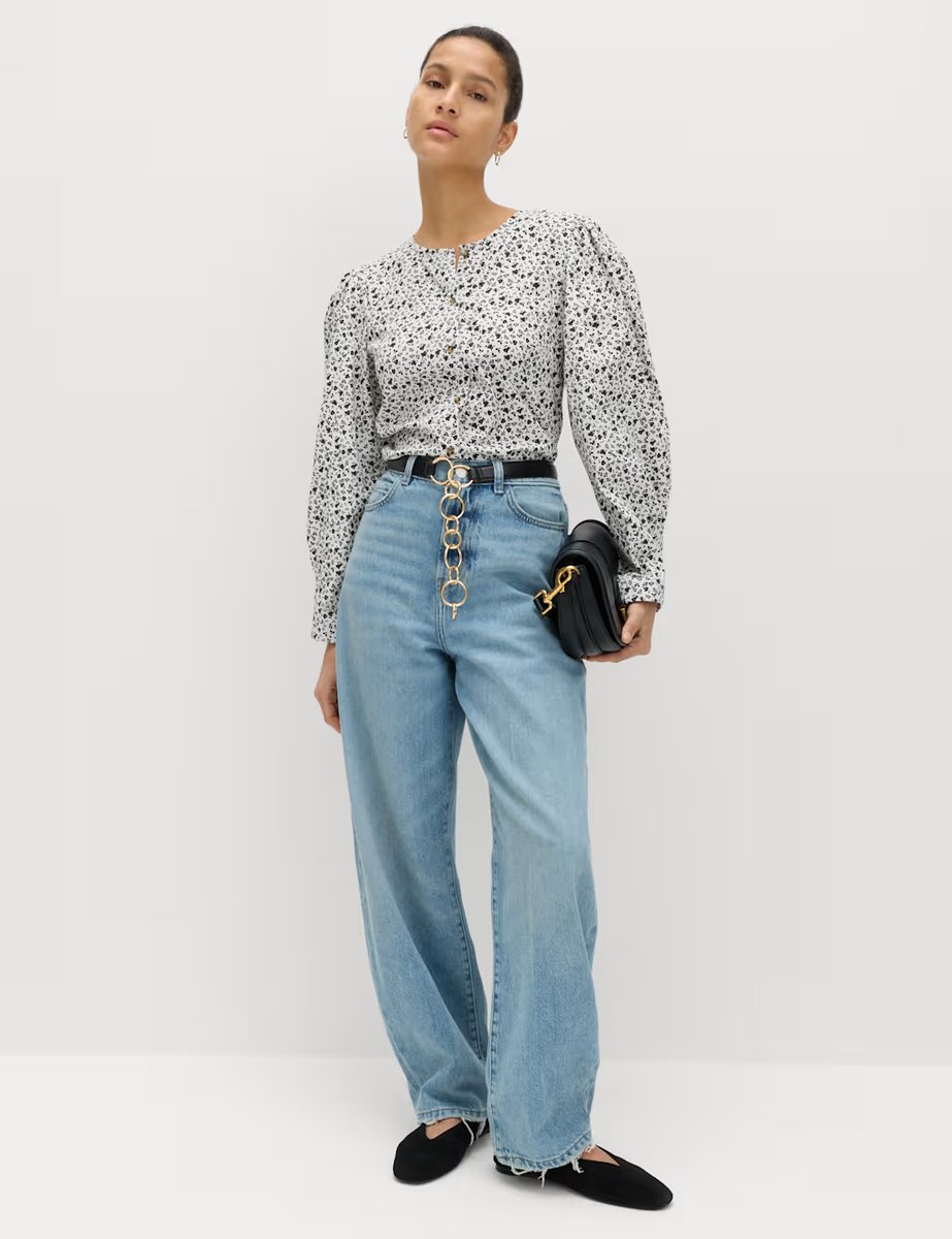 The M&S Pure Cotton Floral Button-Through Blouse in Ivory Mix is ideal for casual, work.
