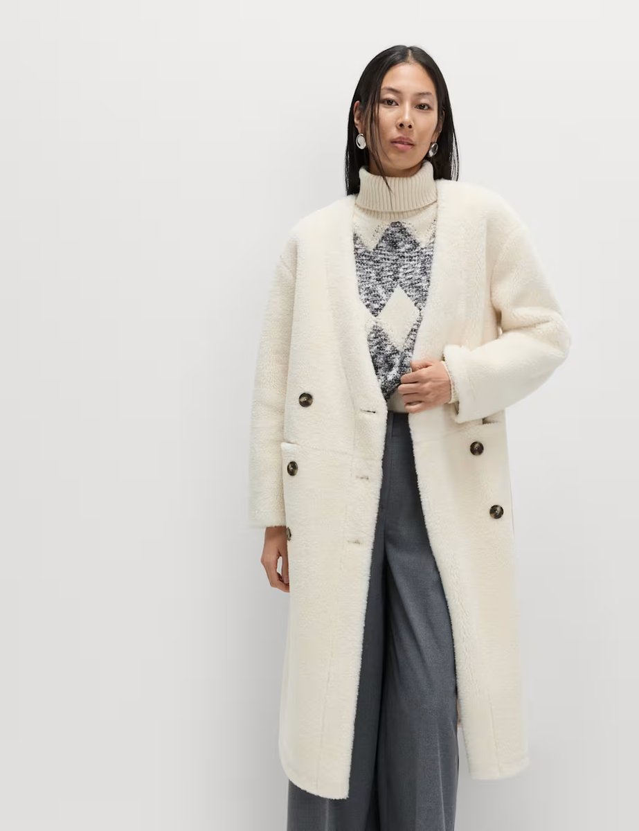 Crafted from sumptuous borg, this coat is cut in a relaxed fit with a longline shape for extra coverage and a modern feel. A collarless V-neckline adds to the sleek look, complemented by contrast buttons fastening at the front.