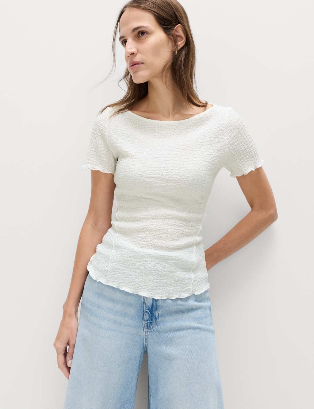Ivory Short Sleeve Textured Top — a versatile wardrobe staple from M&S. Designed with a stylish slash neckline and breezy short sleeves, this top features a textured finish for a distinctive feel. Made from a stretchy fabric, it offers flexible wear and a flattering shape thanks to the seam detailing on the front. Perfect for casual outings and layering.