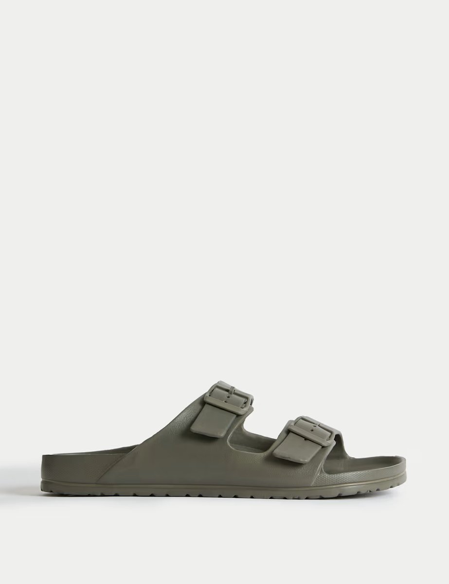 The M&S Khaki Moulded Footbed Two Strap Slider Sandals is available in sizes 10, 11, 12, 6, 7, 8, 9.