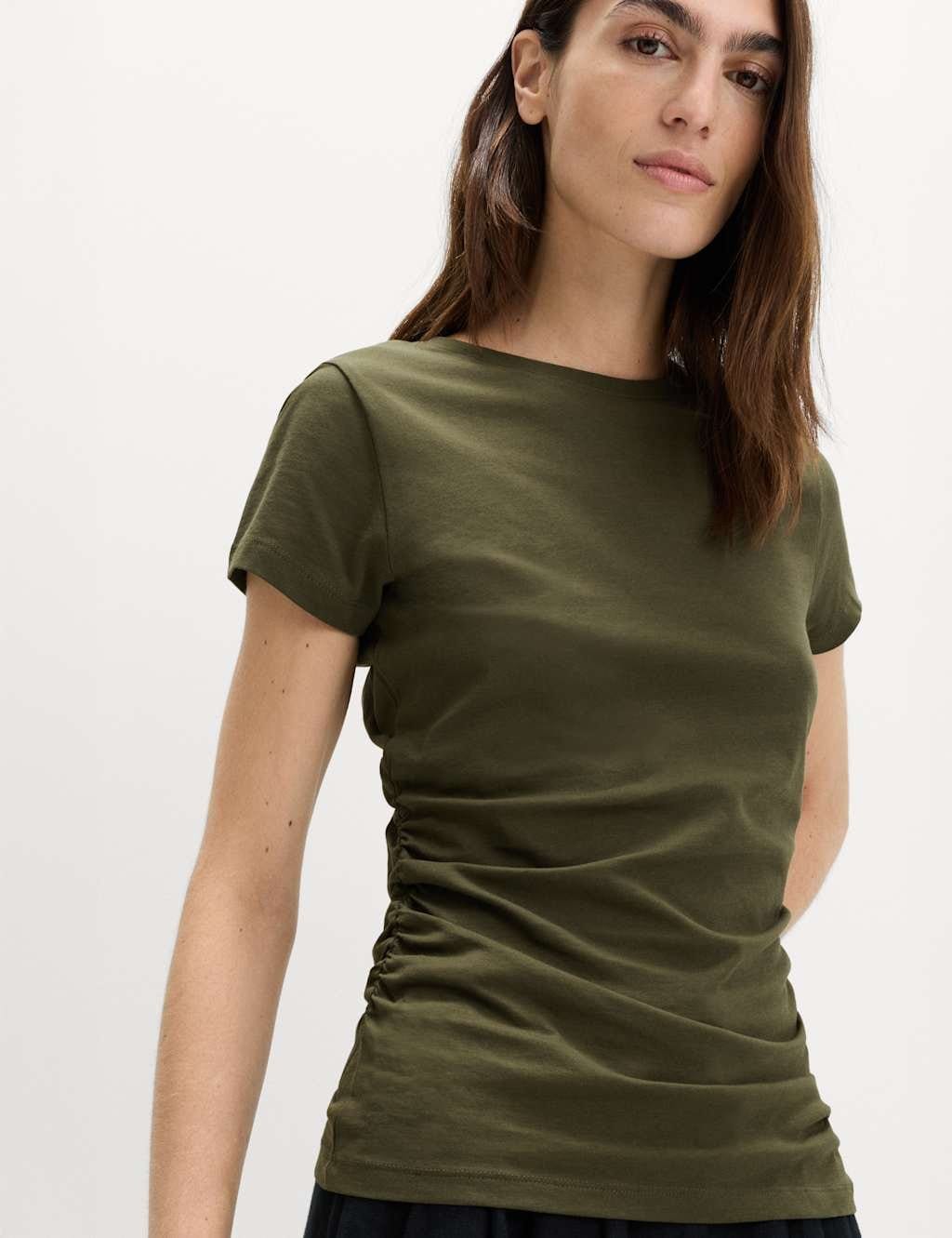 The M&S Khaki Cotton Slim Fit Ruched T-Shirt is ideal for casual, everyday.