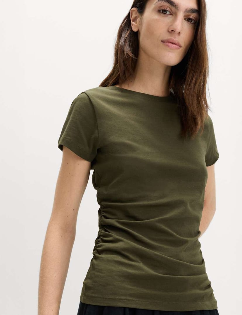 The M&S Khaki Cotton Slim Fit Ruched T-Shirt is made from cotton.