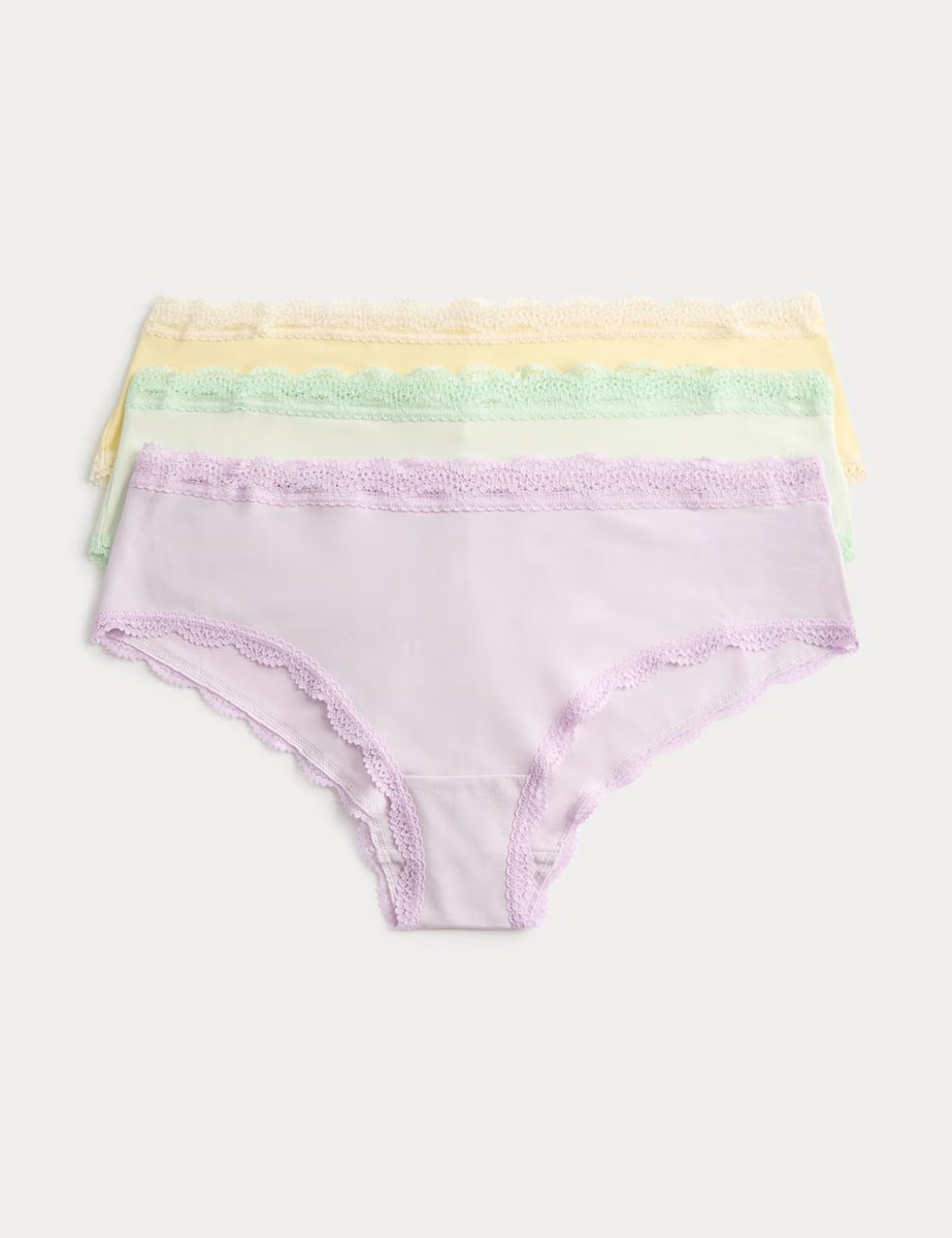These Lavender Mix hipster knickers from M&S feature lace trims for a stylish touch. Made with cotton-rich fabric, they offer a regular fit and added stretch for all-day comfort. Perfect for everyday wear.