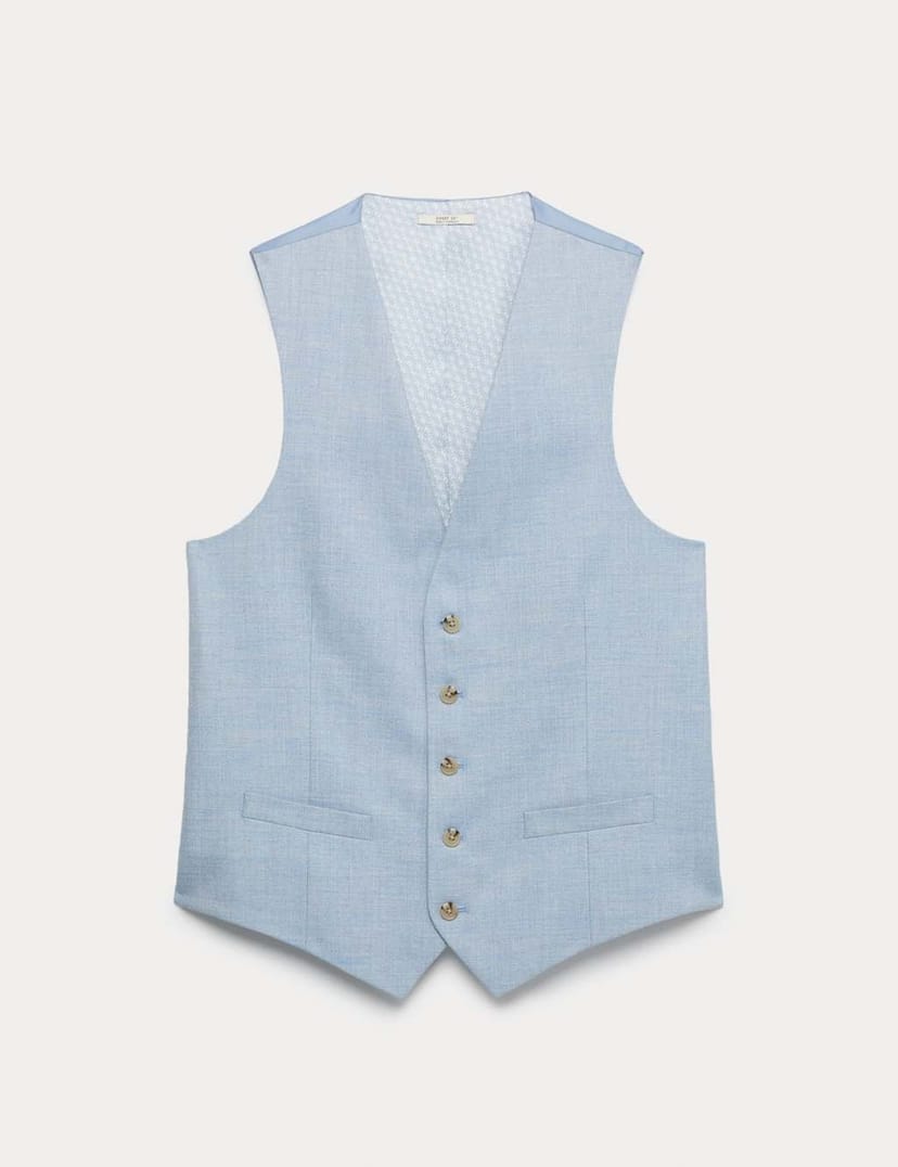 The M&S Light Blue Stretch Waistcoat is available in sizes 34, 36, 38, 40, 42, 44.