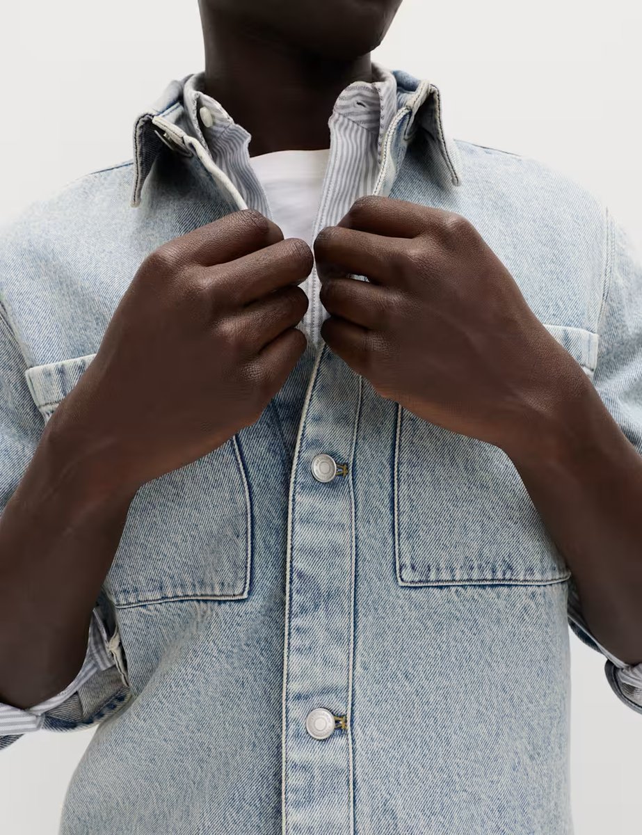 The M&S Classic Denim Overshirt in Light Blue is ideal for casual, smart-casual.
