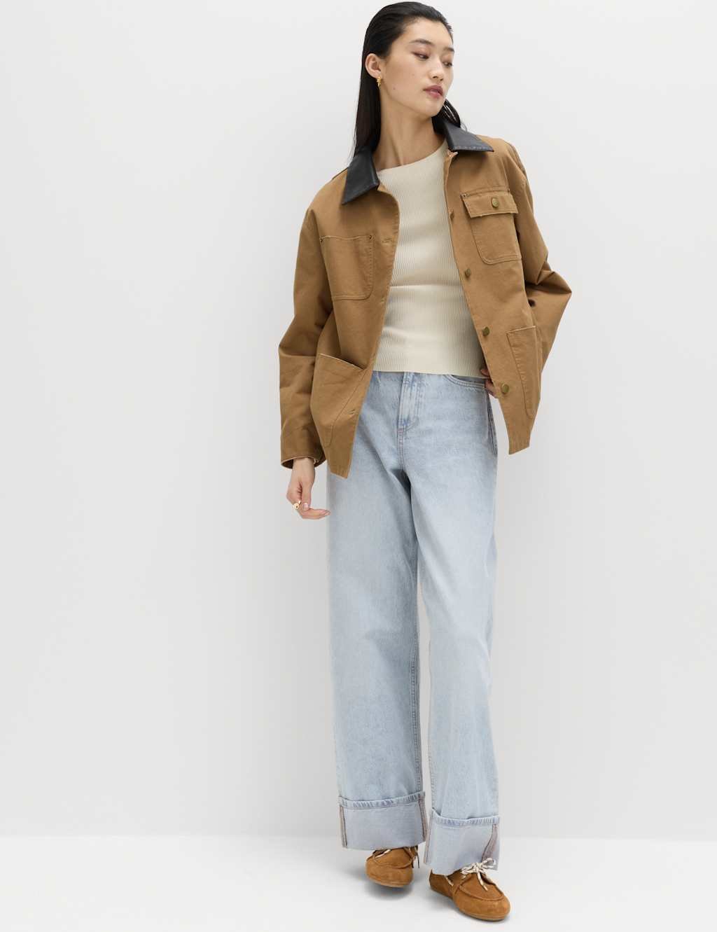 Designed to fit high on the waist, these wide-leg jeans feature a flattering turn-up hem. Made from pure cotton denim for a soft, authentic feel, they are perfect for casual days.