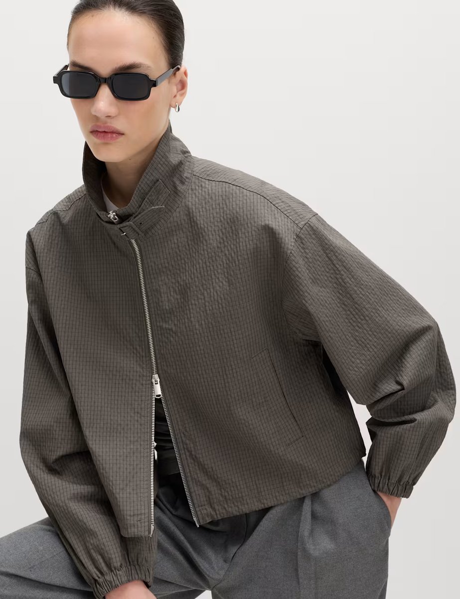 Add laid-back sporty energy to your style with this short light grey, buckle short jacket. It's designed in a relaxed fit, with a two-way zip fastening and a buckle at the high neckline. The washed ripstop fabric gives a textured look, while two welt pockets add a practical touch.