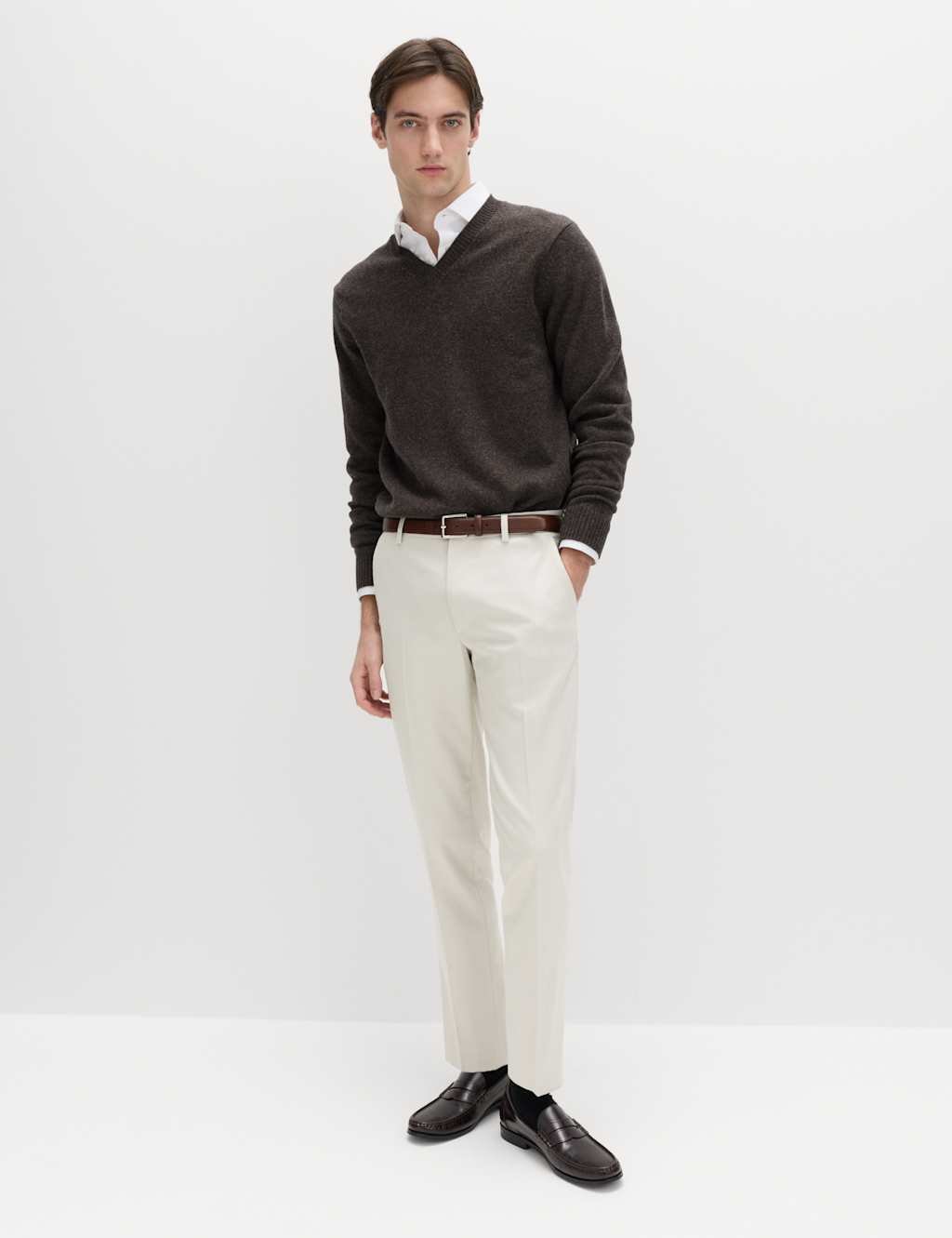 The M&S Slim Fit Smart Stretch Trousers in Light Grey is ideal for work, business, formal.