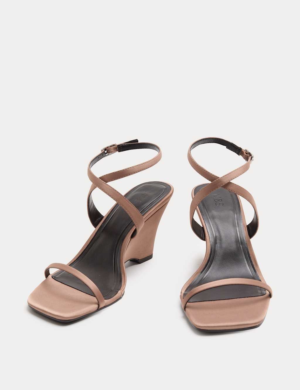The M&S Satin Strappy Wedge Heel Sandals in Mink is ideal for evening, formal.