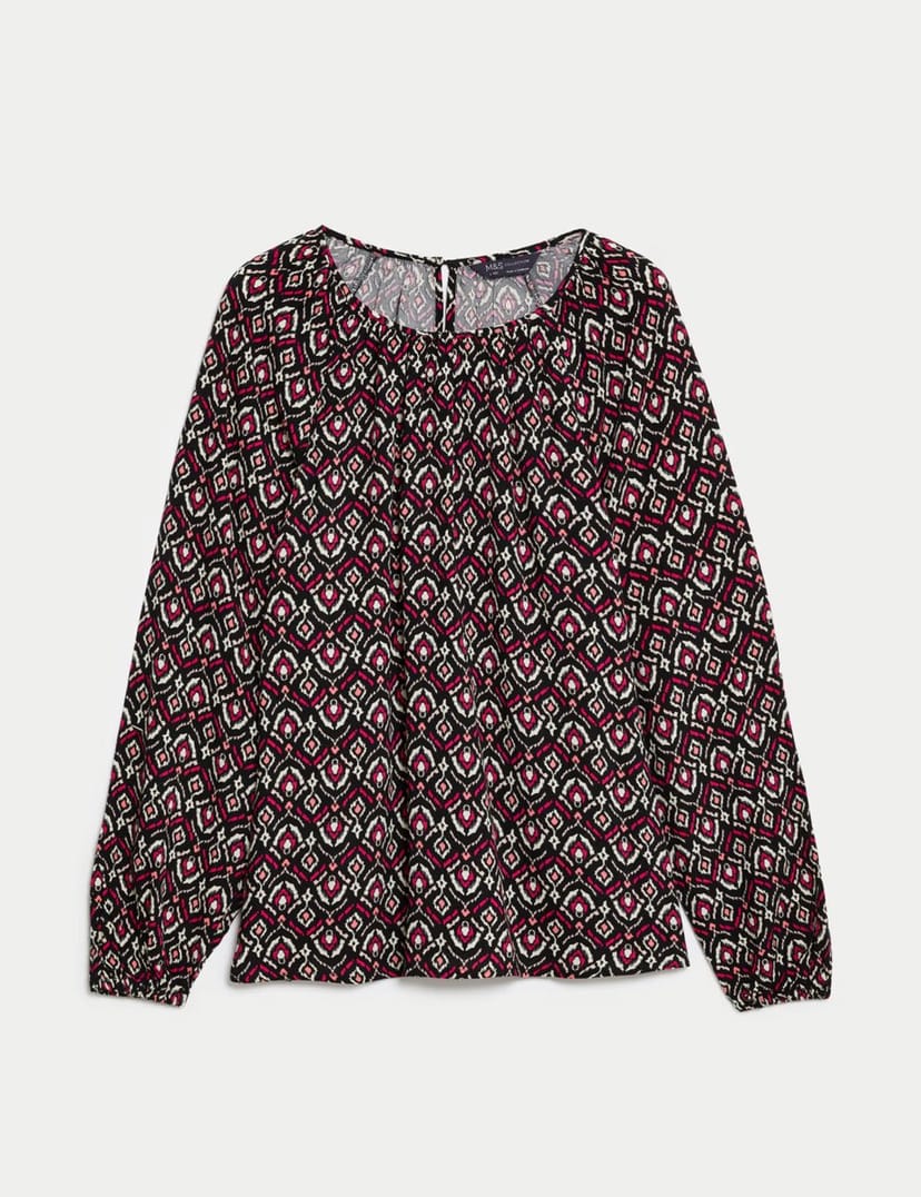 Dress up smart-casual looks with this eye-catching printed blouse. Regular fit for easy wear. The crew neckline features gentle gathering for a looser feel. Elasticated cuffs create a touch of volume through the long sleeves. Finished with a keyhole and single button fastening at the back.