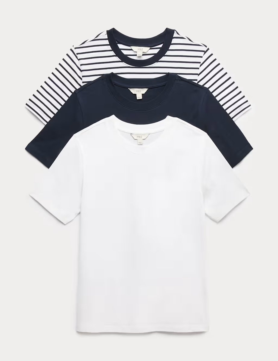Update your casual collection with this three-pack of pure cotton t-shirts. They're cut in our comfortable everyday fit, with a timeless crew neckline and short sleeves. This pack features two plain and one striped design.