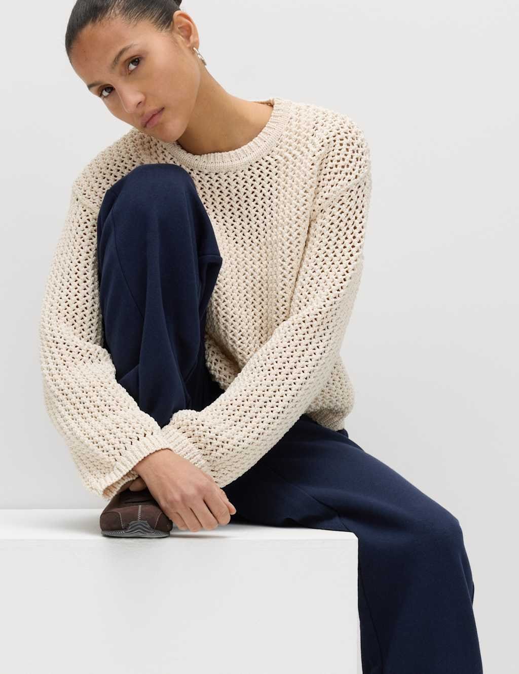 This stylish set includes a cream knit jumper with a textured crochet pattern and navy joggers with a tapered leg. Perfect for a casual, laid-back look.
