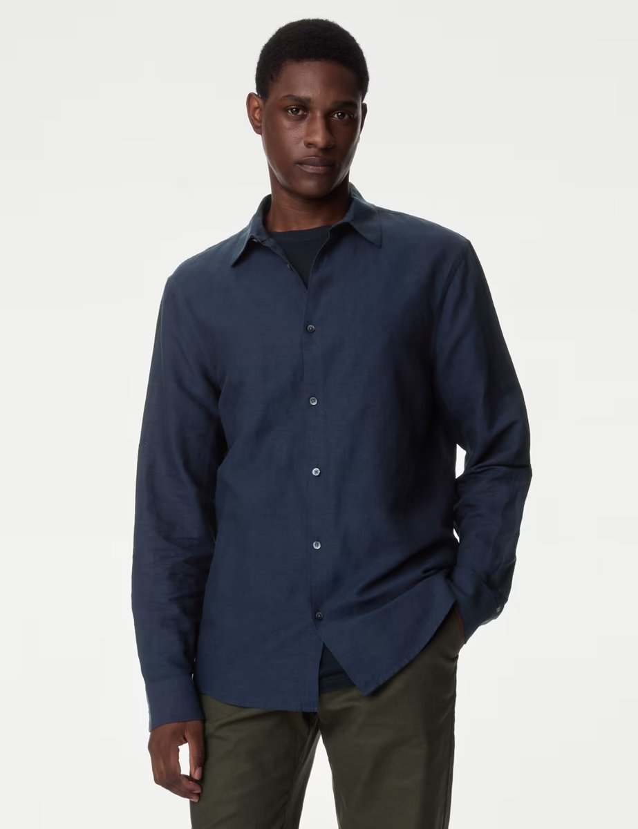The M&S Navy Linen Blend Shirt with Classic Collar is available in sizes MREG.