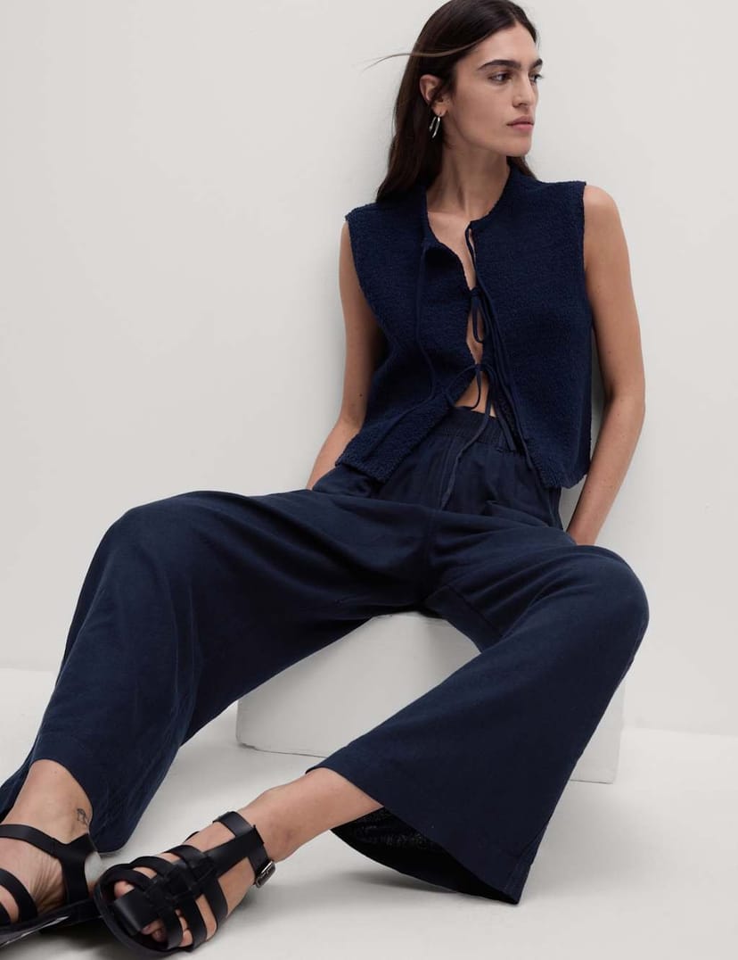 Effortlessly chic warm-weather trousers in navy linen. Featuring a wide leg and cropped length, these trousers are perfect for summer. The high waistband has comfortable elastication and practical belt loops.