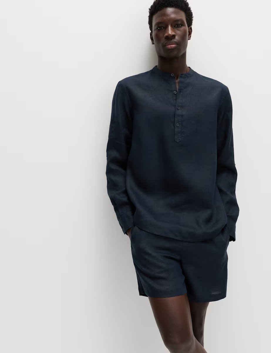 The M&S Pure Linen Grandad Collar Shirt in Navy is ideal for casual, business-casual.