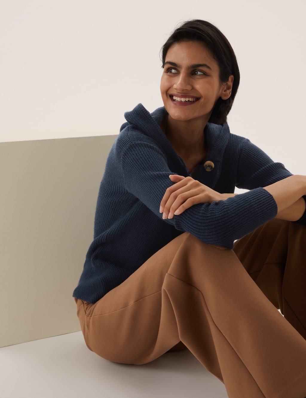 The M&S Soft Touch Ribbed Hooded Cardigan in Navy is ideal for casual, work.