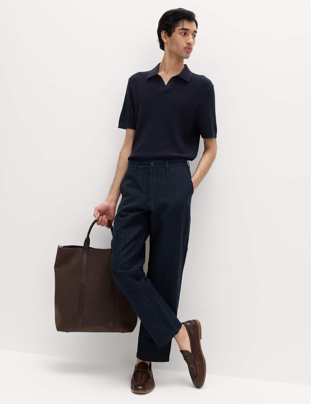 The M&S Regular Fit Navy/Grey Chinos with Linen Blend is ideal for business, casual, smart-casual.