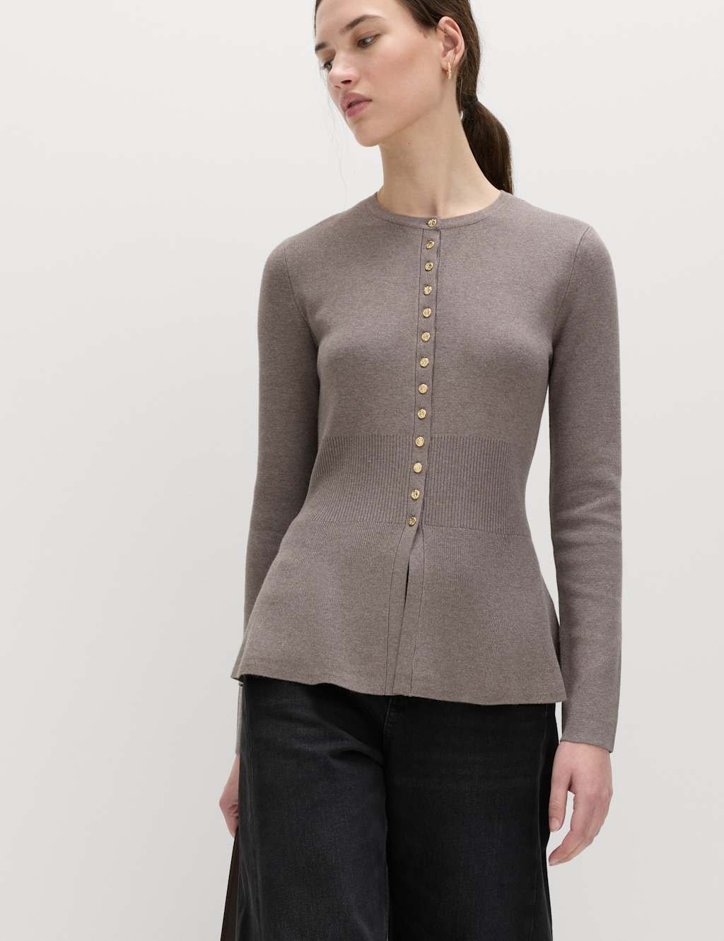 Designed in nutmeg, this crew neck cardigan features a figure-hugging slim fit with metallic buttons adding a hint of shine. The ribbed texture and peplum hem add a feminine flourish.