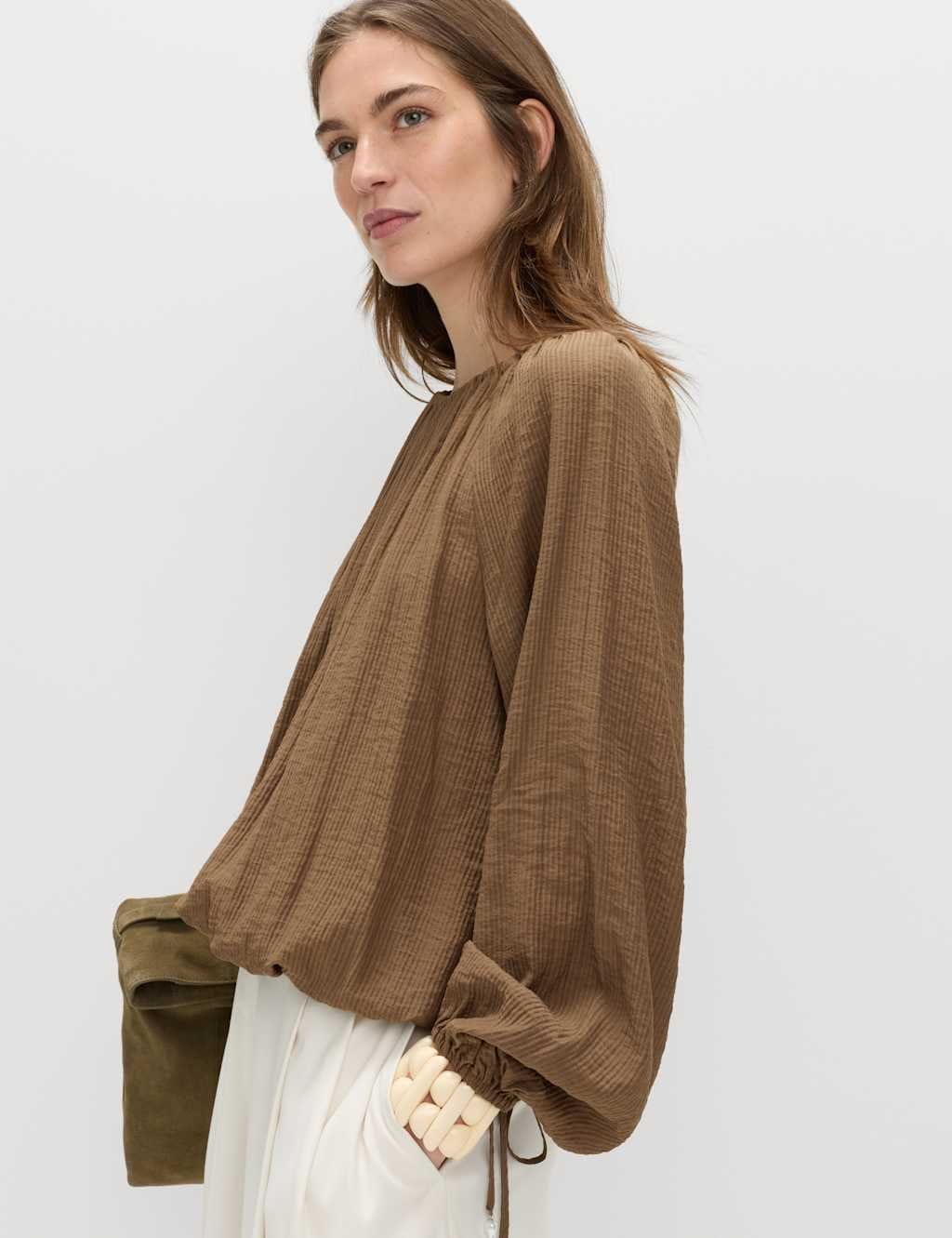 View Marks & Spencer's returns policyCasual olive blouse with a striped plisse finish and tie detail at the cuffs. Features a round elasticated neckline and matching hem. Perfect for everyday wear.