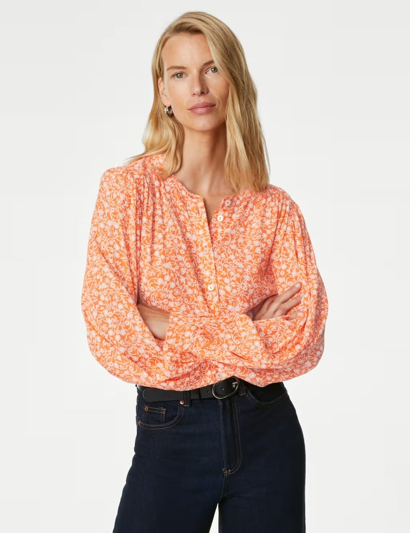 The M&S Printed Longline Button Through Blouse in Orange Mix is available in sizes 8.