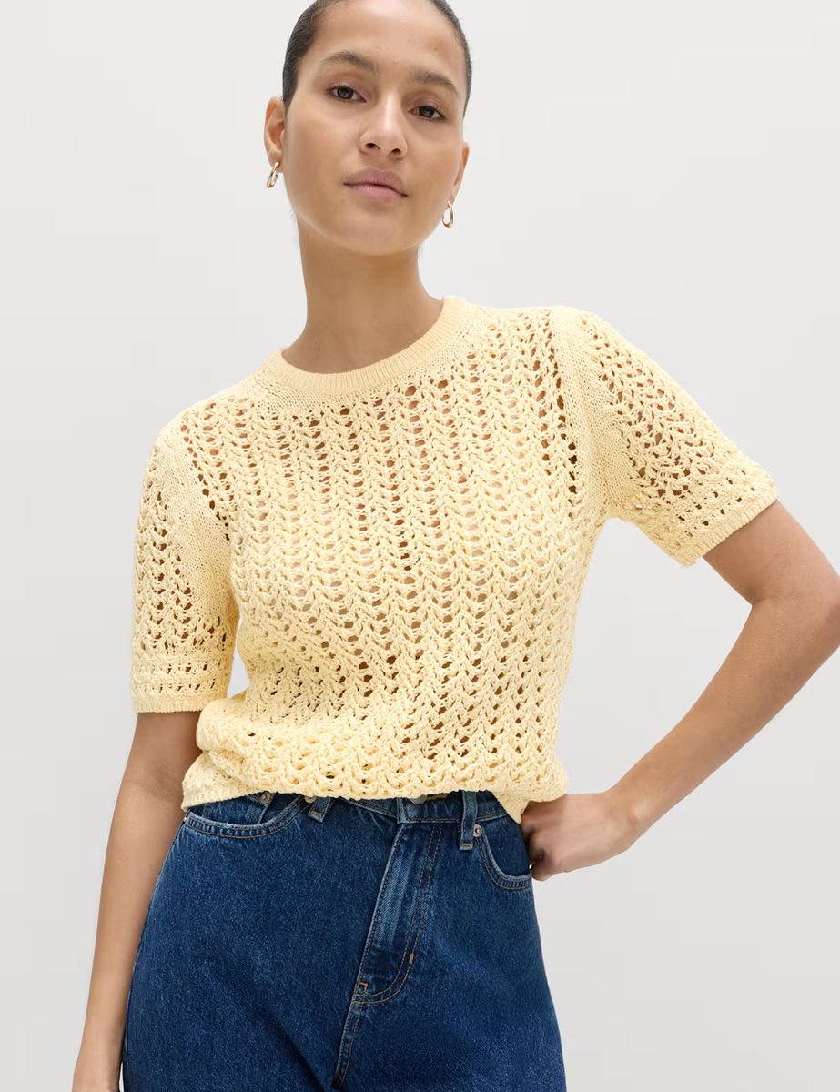 Designed with a slim fit, this top is crafted from cotton-rich yarn in an open stitch for a light and airy feel. Featuring a trimmed crew neckline and short sleeves, it's ideal for warmer weather.