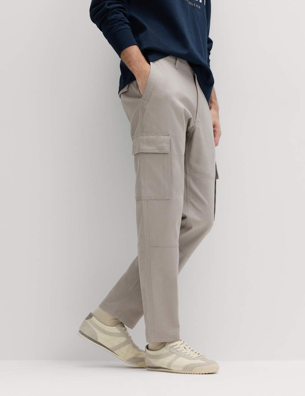 Stylish M&S tapered fit stretch cargo trousers in pebble grey. Made from a blend of cotton and stretch fabric, these trousers offer a modern silhouette with practical cargo details. Ideal for casual wear.