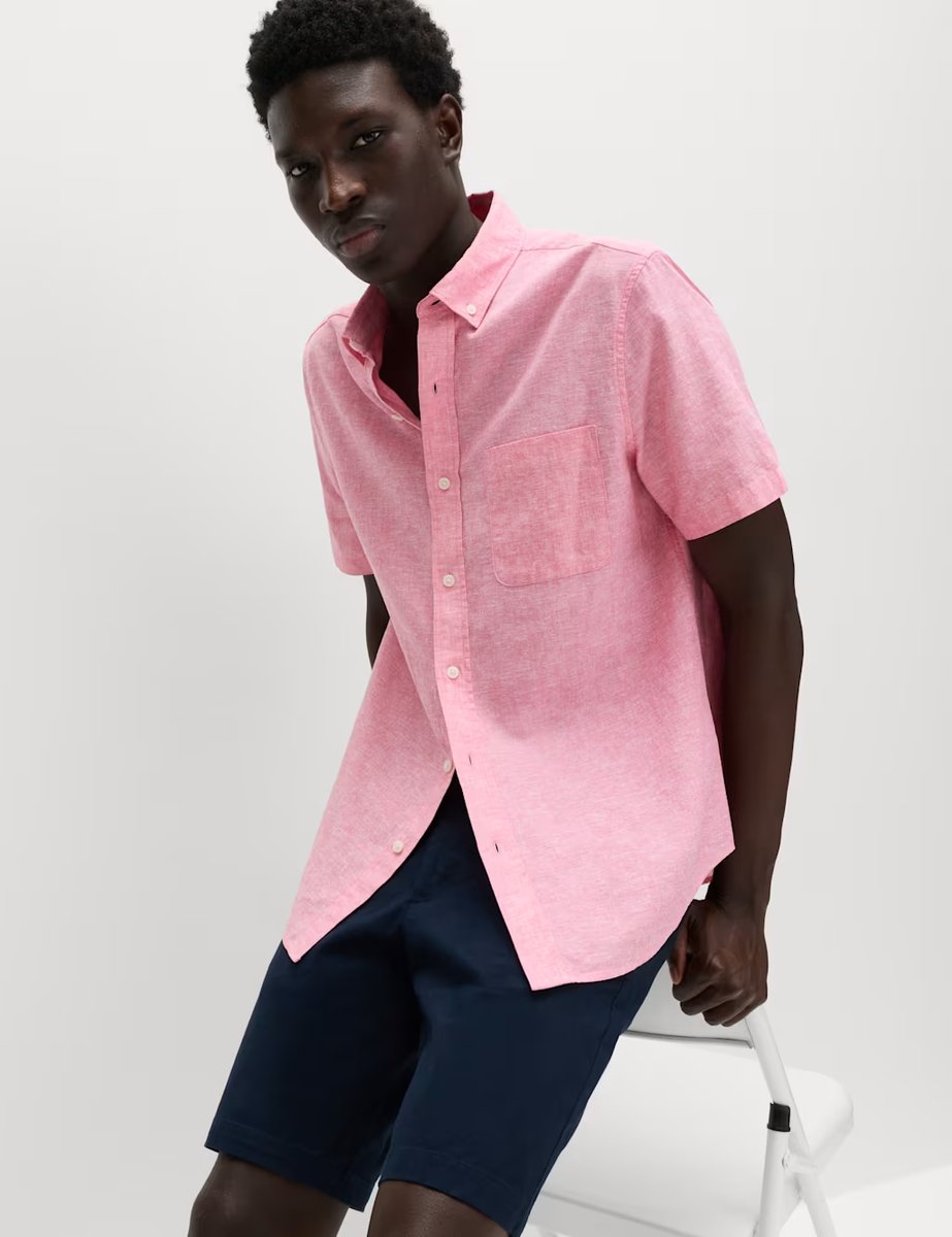 The M&S Regular Fit Linen Shirt in Pink Fizz is ideal for casual, smart-casual.
