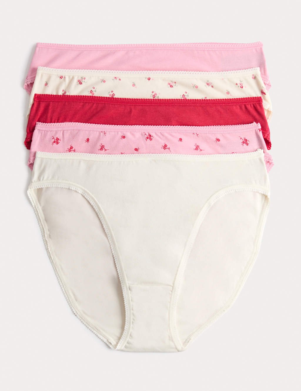 Made from a blend of cotton and Lycra™, these high leg knickers feel soft, breathable and stretchy. They sit high on the leg and waist for a flattering shape. Handy pack of five includes floral, striped and plain designs.