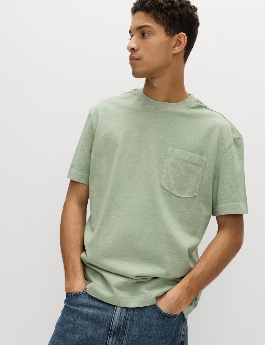 Crafted with a relaxed fit for a slouchy silhouette, this pistachio pure cotton t-shirt boasts a garment-dyed finish for a comfy, lived-in look. Featuring short sleeves and a neat crew neckline, it adds a crisp touch with a patch pocket on the chest.