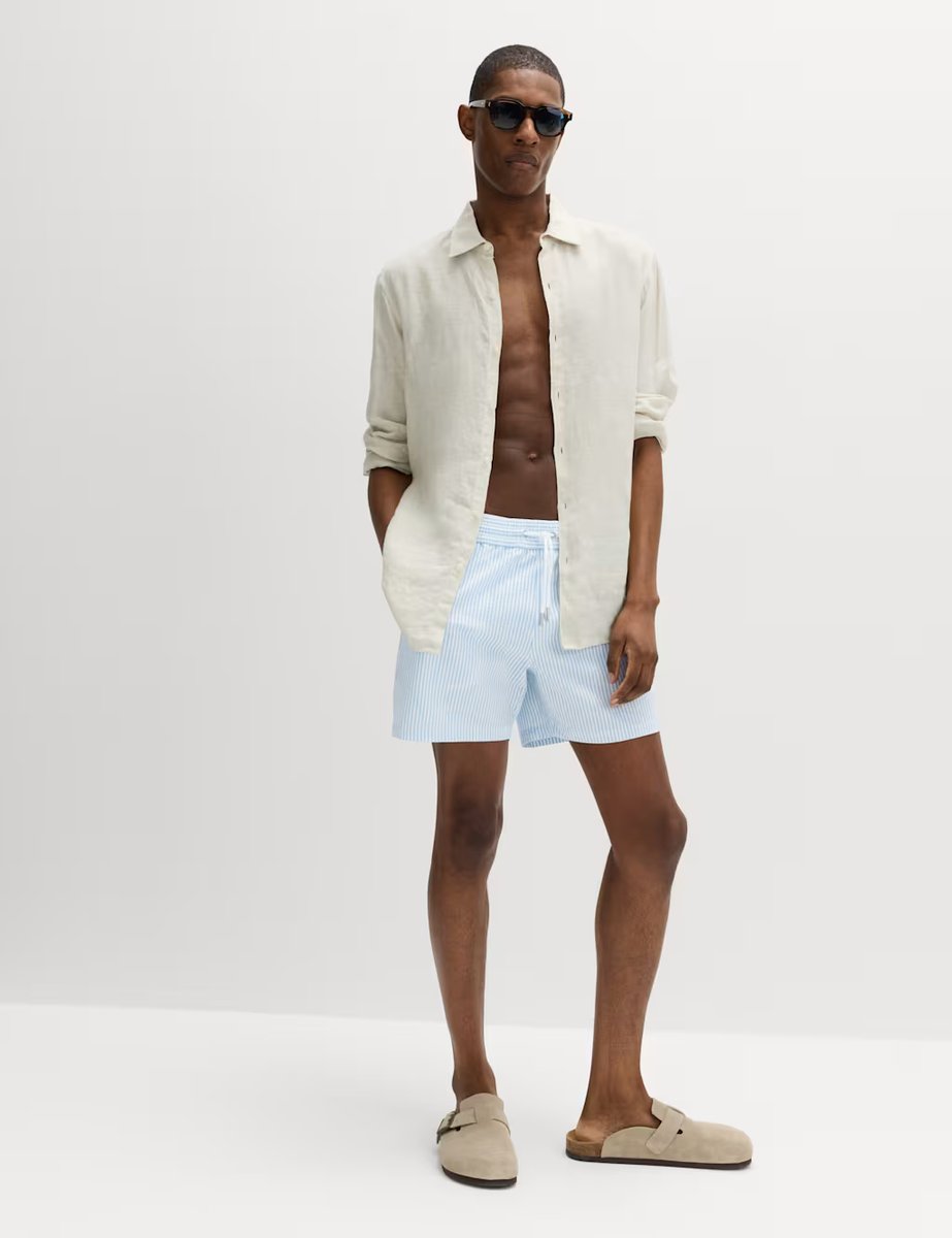 Designed with powder blue, regular fit, elasticated waistband, and vertical stripes on textured seersucker fabric, these swim shorts balance style with functionality. Perfect for beach days and beyond.