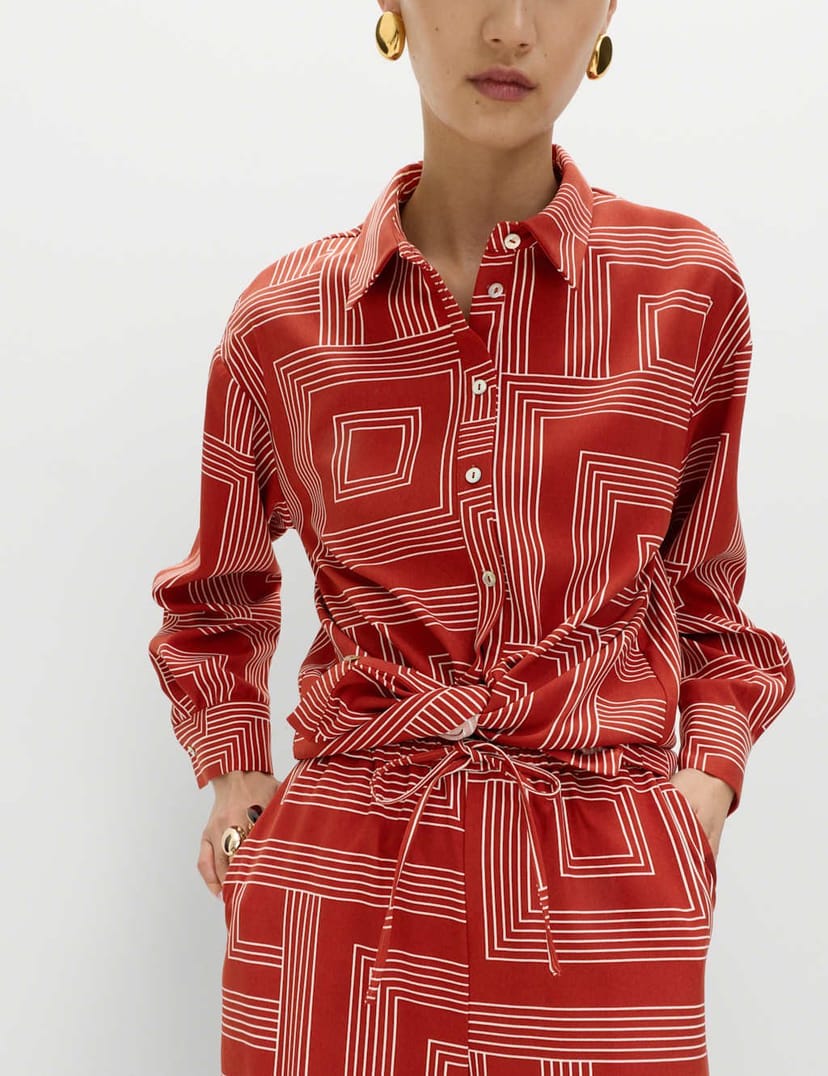 The M&S Red Mix Geometric Print Collared Shirt is available in sizes 10, 12, 14, 16, 18, 20, 22, 24, 6, 8.