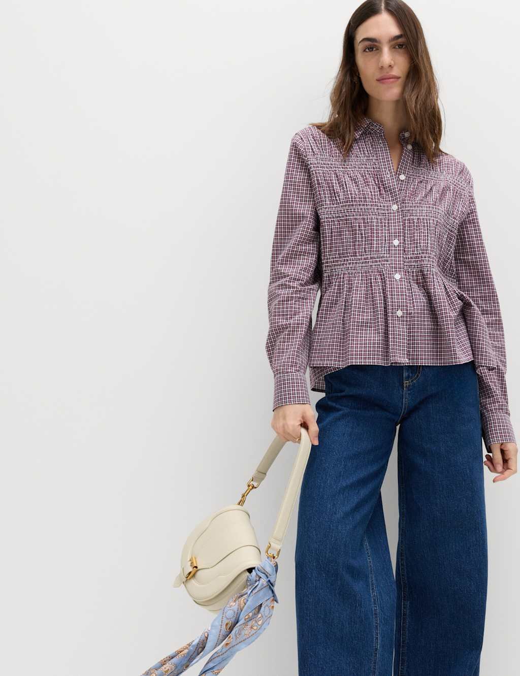 Stylish red and white checked long-sleeve shirt with a slim fit and shirred detailing on the front. Features a smart collar and button-through fastening. Cuffed sleeves for a neat finish. Perfect for versatile dressing.