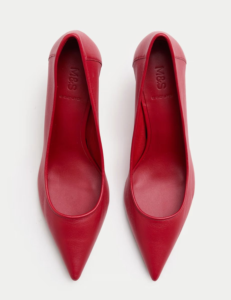 The M&S Red Leather Stiletto Heel Pointed Court Shoes is available in sizes 3, 4, 5, 6, 7, 8.