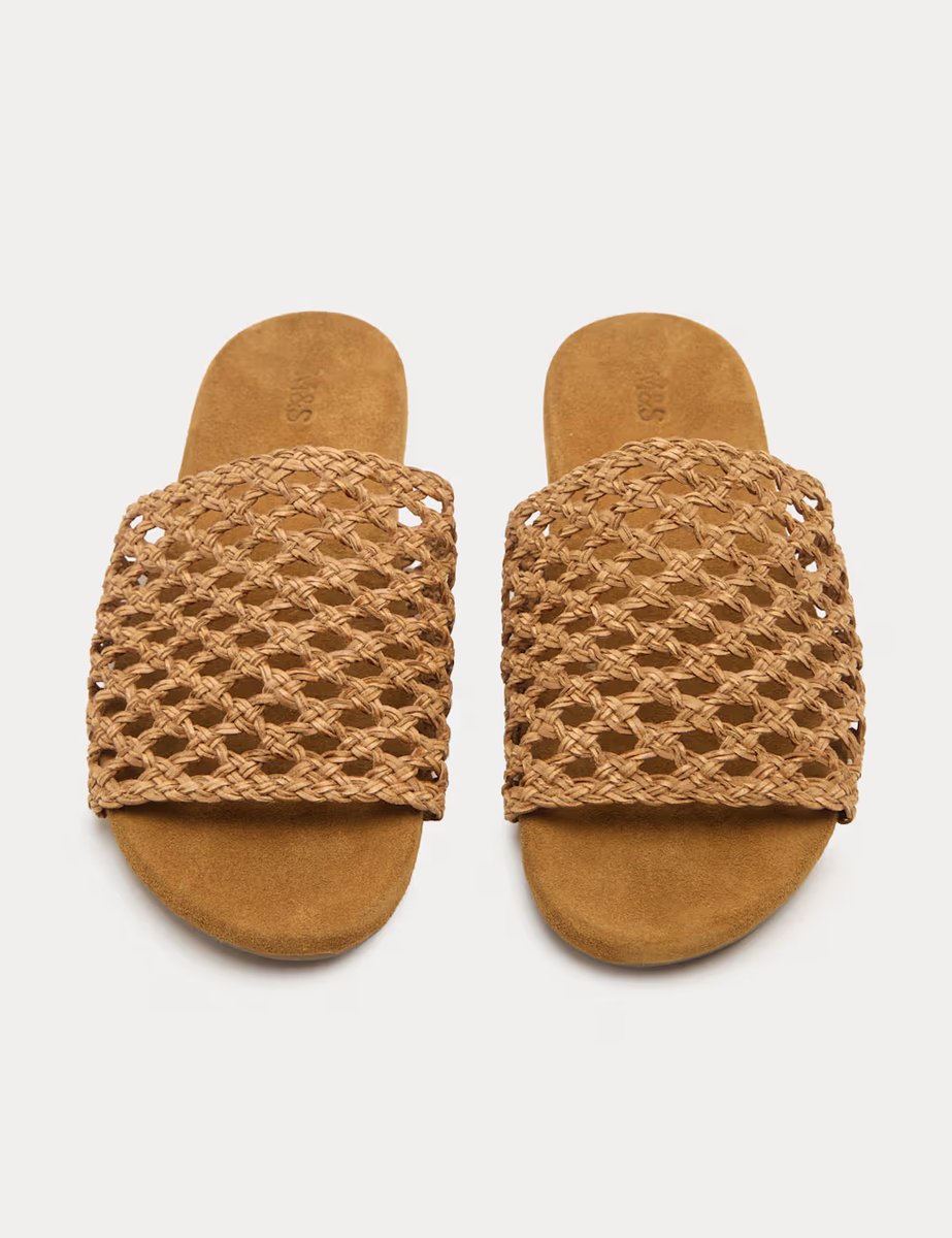 The M&S Elegant Leather Woven Open Toe Mules in Sand is available in sizes 3, 4, 5, 6, 7, 8.