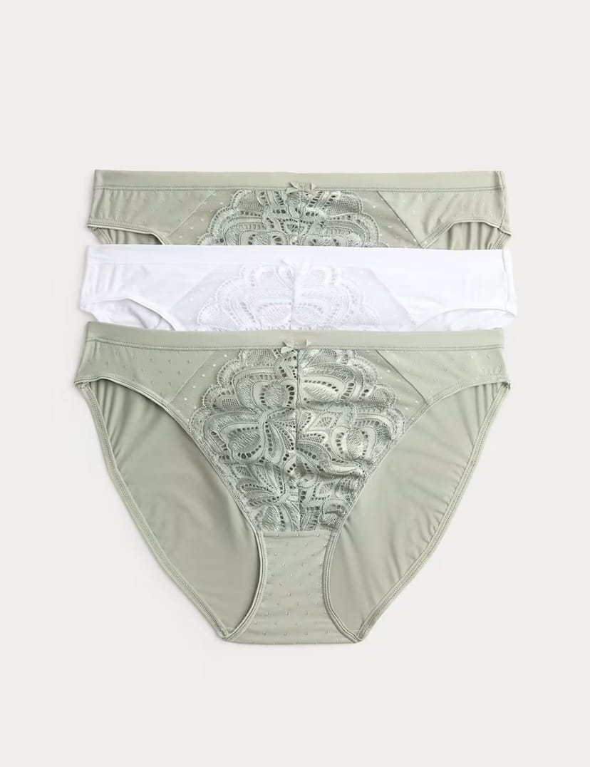 Bring a touch of texture to your lingerie drawer with this three-pack of high leg knickers. They sit high on the leg and waist for an elongating effect. The floral lace combines with spotted sides for a delicate mix of textures.