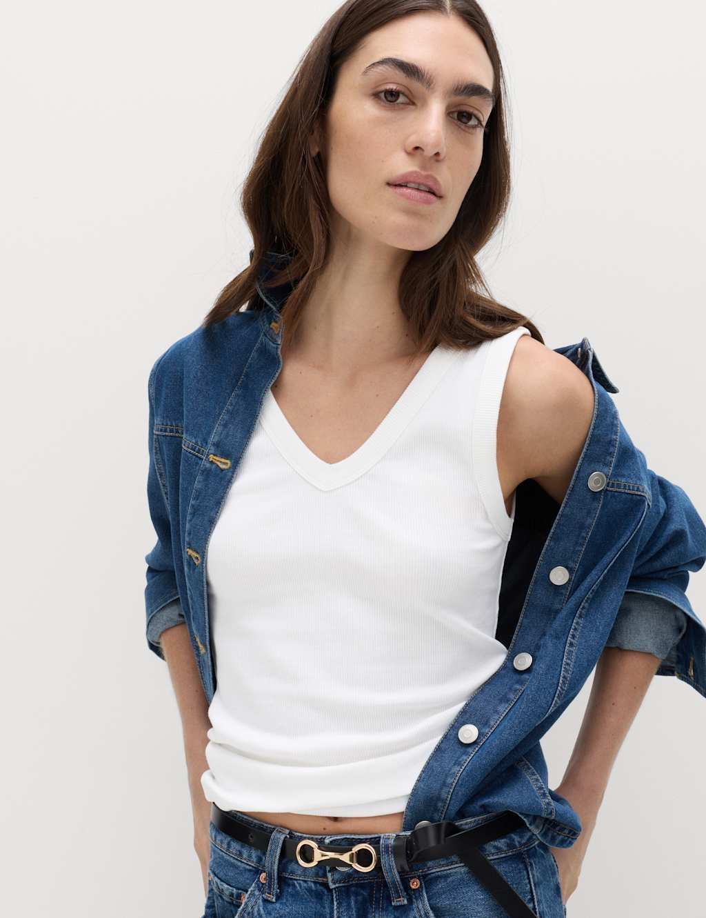 The M&S Cotton Rich Ribbed V-Neck Vest in Soft White is ideal for work, business, smart-casual.