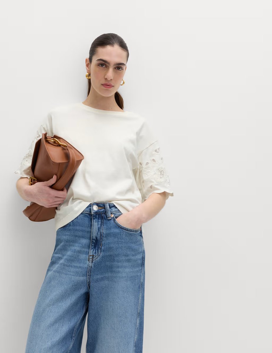 Crafted from pure cotton, this Soft White boxy t-shirt by M&S offers a regular fit with dropped shoulders and intricate broderie detailing on the sleeves for a touch of femininity. Ideal for casual outings.