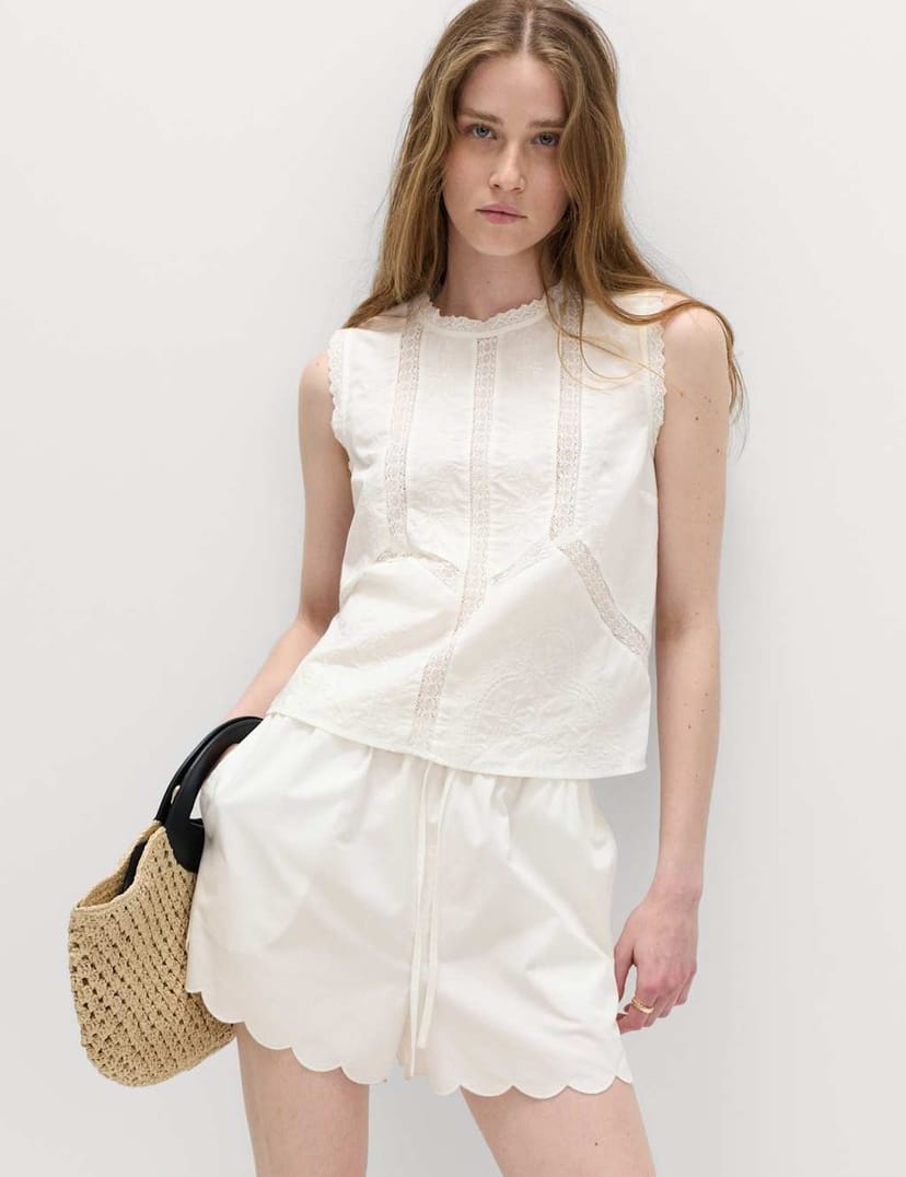 This soft white cotton top brings dainty elegance to your warm-weather wardrobe. It has a regular fit, with a comfortable round neckline and a sleeveless design. Lace inserts and embroidery add romantic styling, while a tie at the back beautifully finishes the piece.