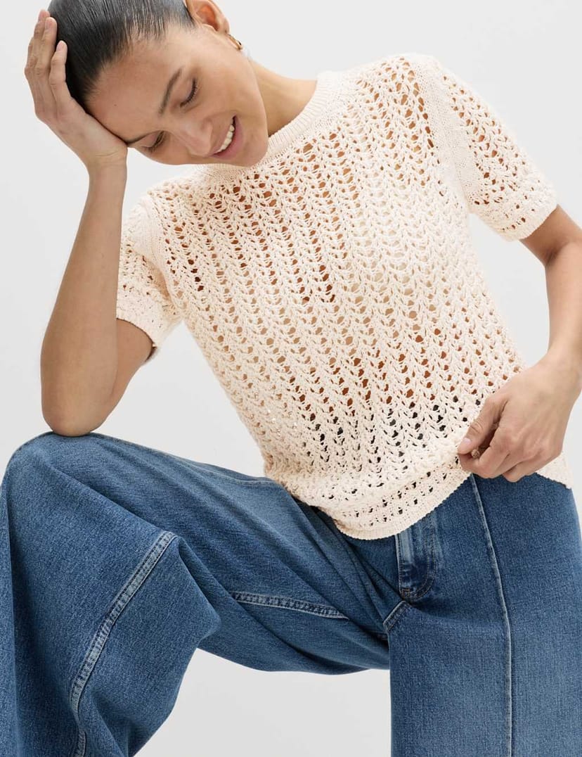 This M&S top is crafted from cotton-rich yarn in an open stitch for a light and airy feel. It's designed in a flattering slim fit, with a trimmed crew neckline. Short sleeves make it ideal for warmer weather.