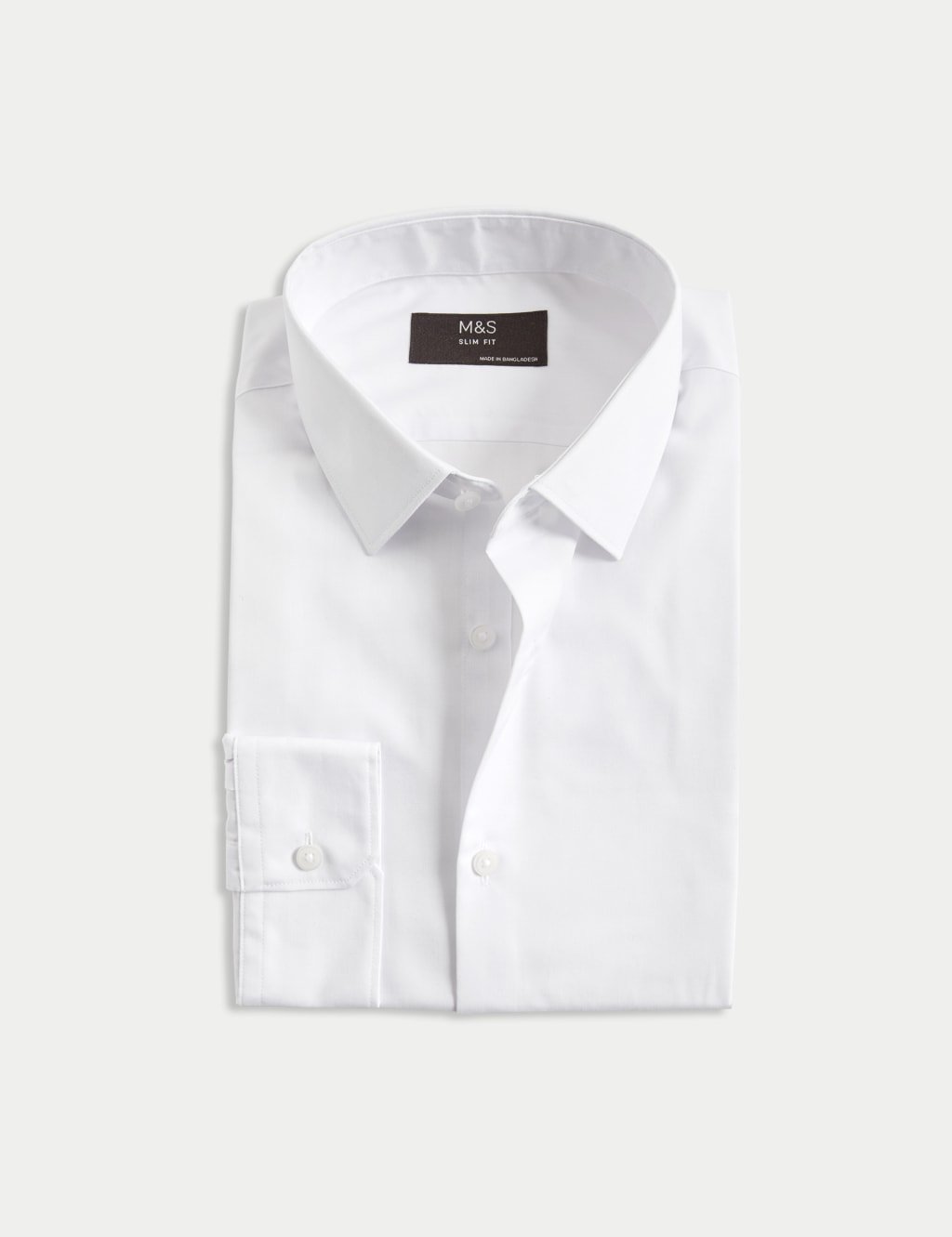 The M&S Slim Fit Easy Iron Cotton Rich Shirts in White is available in sizes 14½, 15, 15½, 16, 16½, 17, 17½.